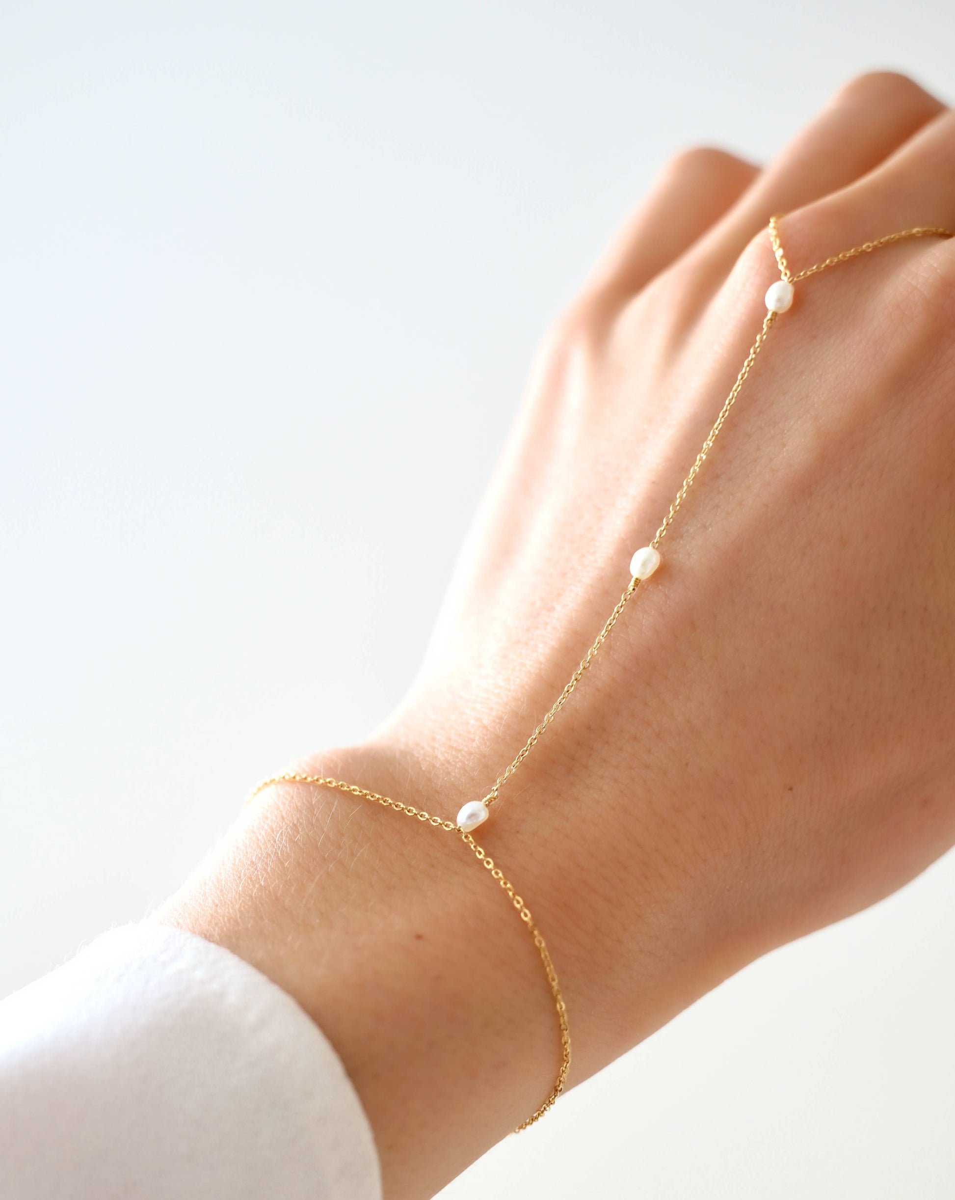 This hand jewel is composed of a fine stainless steel chain set with three freshwater pearls. The bracelet has a small 3cm adjustment chain, so it fits the size of your wrist. It is therefore perfect for gifting. It pairs very well with other small gold bracelets. DETAILS: • Pearls: Freshwater pearls • Material: Stainless steel • Bracelet length: 15.5cm + 3cm adjustment chain • Pearl dimensions: 4x3mm • Waterproof 💧 ♥ All jewelry is sent in a small linen pouch ♥